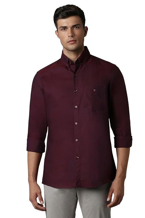 男士易于护理的棉质修身版型纯色休闲衬衫,具有自然弹力