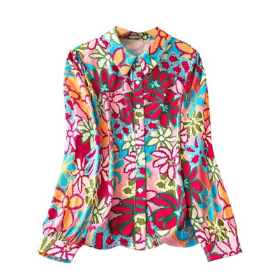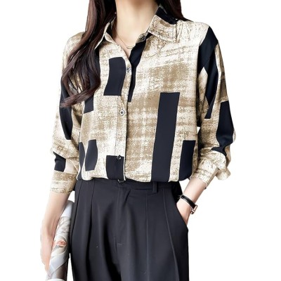 女孩和女式纯色人造丝彩色休闲版型翻领开衫衬衫彩色花朵印花长袖披肩有领开襟女式衬衫(衬衫 53)