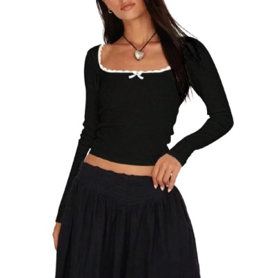 纯色方领长袖蕾丝蝴蝶结细节时尚 Y2k 罗纹女式上衣